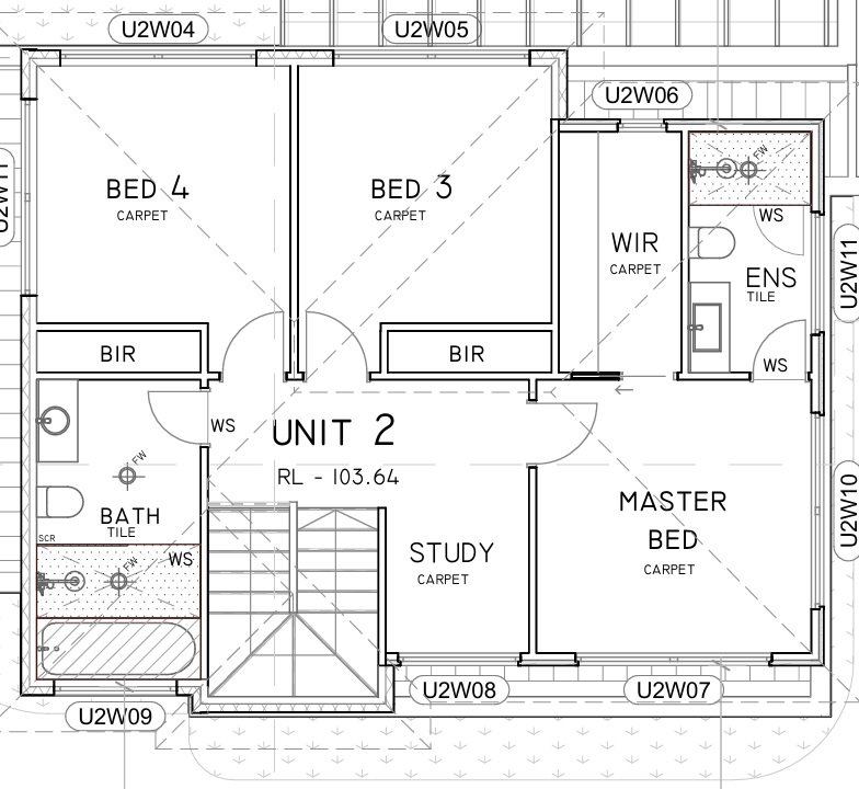 FF - stairs, shared bath wc, bed 4, bed 3, ensuite WIR, study,